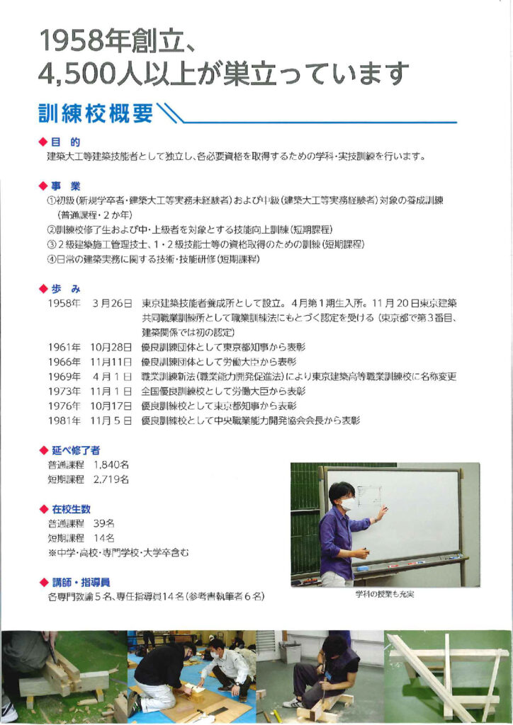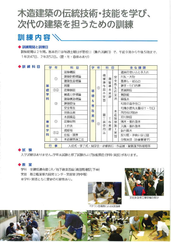 職業能力開発促進法にもとづく東京都認定の普通課程建築施工系木造建築科の職業訓練校として「東京建築高等職業訓練校」があります。